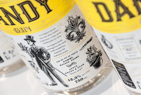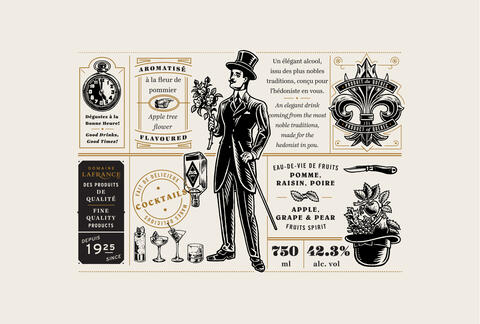 Introducing the Dandy, a sophisticated spirit that doesn’t take itself too seriously. We opted for a vaudeville vibe when crafting an identity for this tasty and expressive upscale gin made in Quebec. What to call such a rakishly charming spirit? “Dandy,” what else? Adopting an old-style ad aesthetic, Dandy tells its story in illustrations right on the label. Details about the distilling process, the source of the ingredients, and the best way to enjoy the product are organized in a visually appealing way to define the brand codes.