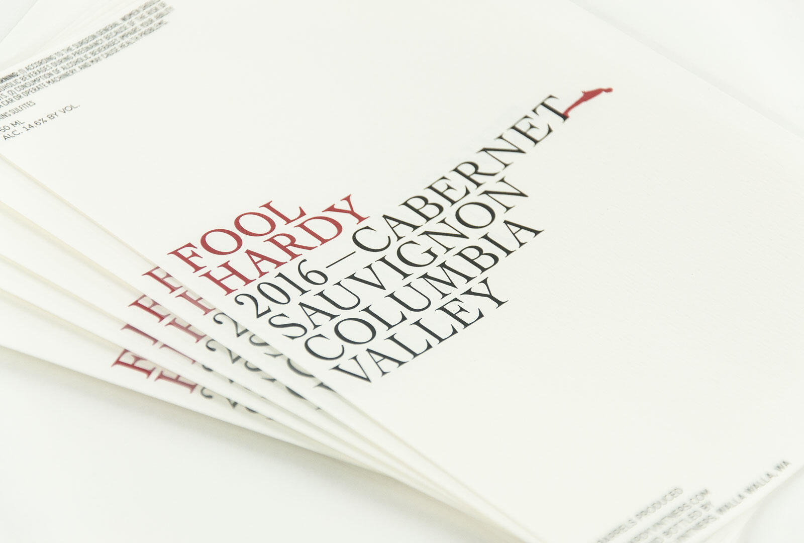 Two daring and determined wine producers had chosen the State of Washington - a still unknown and often despised territory by the purists - to create their first wine. The Foolhardy is a top-quality Cabernet Sauvignon stemming from the best vineyards around. Our job was to develop a brand that would translate the nobility of this precious vintage while honouring the rebellious character of its name. Also, we had to put forward the foundations of a graphic system that would accommodate many more varietals.