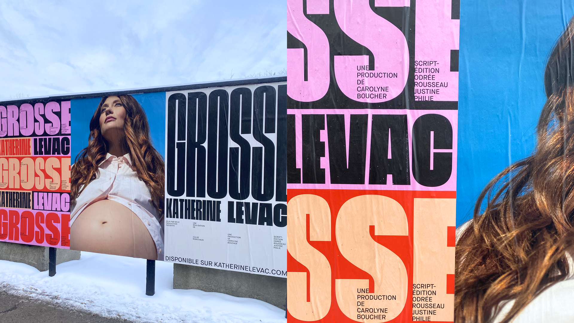 Série d'affiches pour promouvoir le spectacle-captation en ligne «Grosse» par Katherine Levac. Le spectacle traite de grosso-phobie, de grossesse et de reproduction assistée, trois gros sujets avec lesquels la comédienne et humoriste jongle avec brio. L'idée graphique derrière l'affiche est toute simple: le choix d'un typographie variable pour occuper un maximum d'espace sur différentes plateformes et formats, assurant impact et modularité.