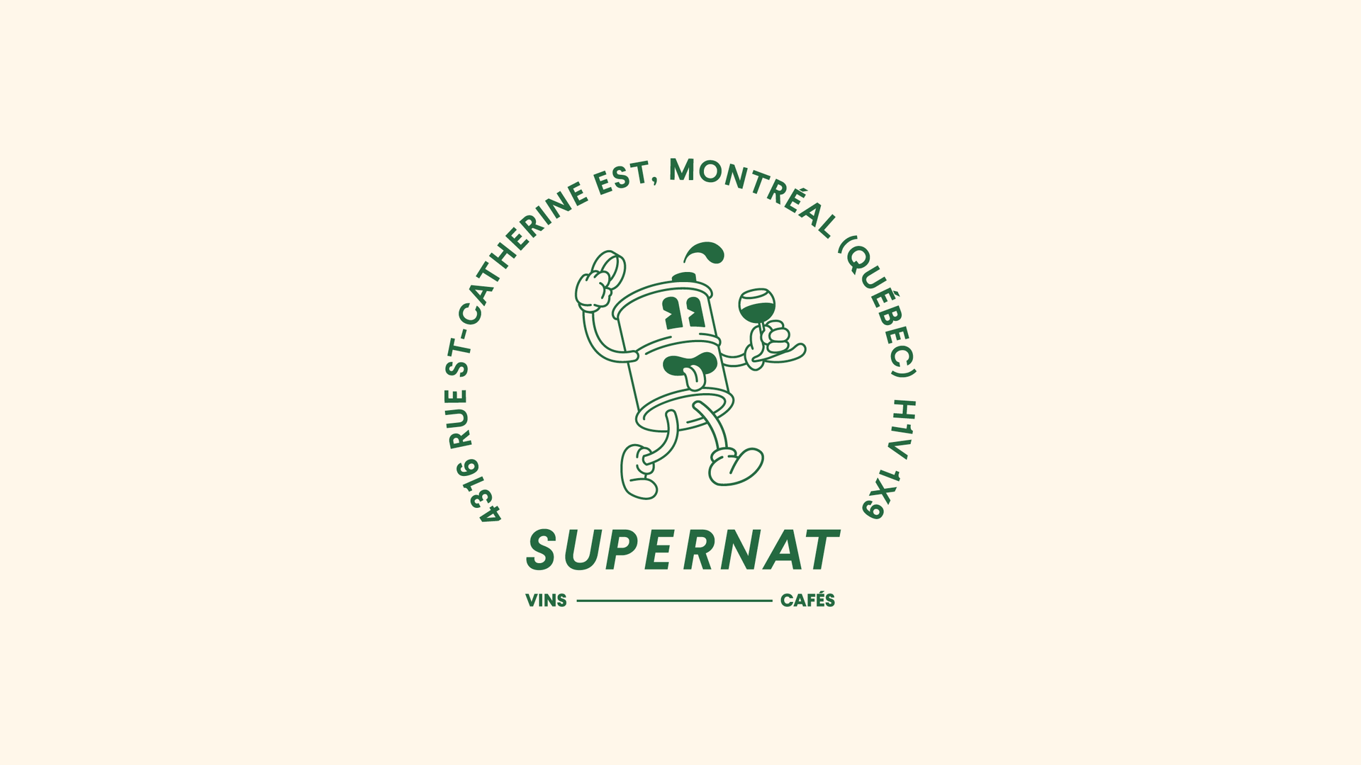 Le Supernat est un bar à vin et café situé dans le quartier Hochelaga-Maisonneuve à Montréal. L'inspiration derrière la création du branding vient de l'esthétique d'une station d'essence mais aussi de la dualité de l'offre, un café de jour et un bar à vin de nuit.